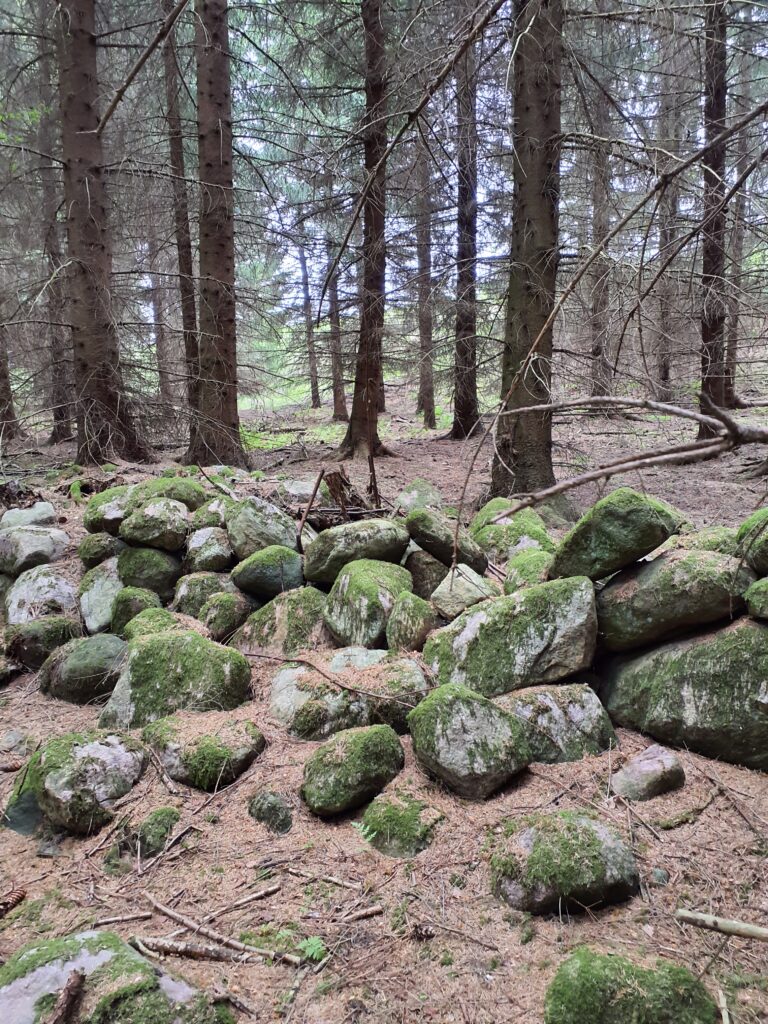 Undersökningarna sker i de flesta fall i form av utredningar. I en del fall hittar vi lämningar som behöver undersökas vidare, och då blir det tal om arkeologiska förundersökningar. Men många lämningar bedöms vara från historisk tid och registreras som så kallade övriga kulturhistoriska lämningar. Det kan röra sig om till exempel stengärdesgårdar och bebyggelselämningar. Ofta är de rester av ett äldre jordbrukslandskap. De har inte lika starkt lagskydd som fornlämningar men är ofta värdefulla att bevara, ur både kultur- och natursynpunkt. På bilden ser ett exempel på en äldre stengärdesgård i en granskog, samt hur det kan se ut när vi gräver sökschakt i åkermark. Den som vill läsa mer kan hålla utkik här på vår hemsida där vi succesivt publicerar vetenskapliga rapporter från våra undersökningar i Ulricehamn.