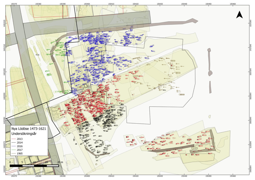Våra arkeologer Jonathan, Caj, Mats P och Amanda jobbar, bland annat, med att författa stratigrafiska berättelser, det vill säga sätta samman en kronologi, över några av stadens stadsgårdar och gator samt kyrka och kyrkogård, men skriver även om området kring strandzonen, anläggandet och utvecklingen av Nya Lödöses norra strandskoning och anslutningen av stadens gator mot de så kallade timmerkistorna. Detta är ett delvis knepigt pussel då det involverar att väva samman resultat från flera års grävningar till en helhet, men det är detta arbete som kommer lägga grunden för rapporterna och för vår förståelse av hur staden etablerades och utvecklades.