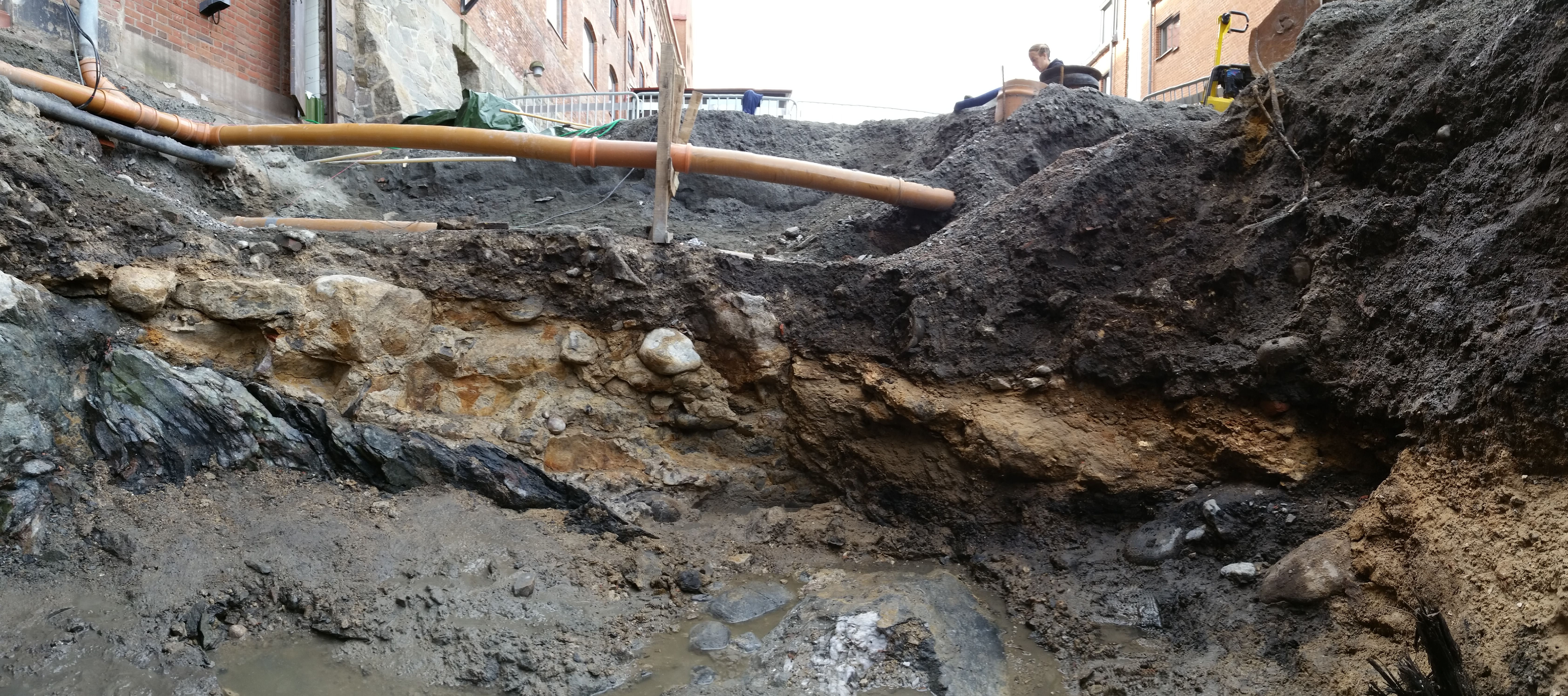 Den del av befästningsmuren som sprängts bort var 4,5 meter lång och cirka 3,4 meter bred. Muren har uppförts på hälleberg. Mot murens utsida (Göta Älv) kunde vattenavsatta lager dokumenteras och över dessa fanns bevarade jordlager med fynd. Den bevarade höjden av muren i kanten av schaktet är 1,4 meter. I den östra och västra sidan av schaktet finns bevarad förlängning av befästningsmuren. I schaktets södra del påträffades omrörda raseringslager. I schaktets östra kant påträffades även lämningar efter 1800-talets industriverksamhet på platsen. Efter att dokumentationen genomförts täcktes skadan med markduk och därefter med särskiljande grusmaterial. Ovanpå grusmaterialet placeras sedan fettavskiljaren.